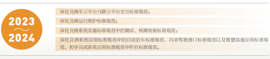 协同欲成,标准先行。针对车路协同自动驾驶技术标准体系发展规划,张健表示,2020-2023年,中国公路学会计划实施11个方面的框架和标准规范的建设工作,包括总体系统标准规范的框架体系、自动驾驶道路设计标准规范、智能路侧系统技术标准规范、车载OBU控制系统、车辆底盘域系统和其他系统、V2I与V2X的通信标准体系框架,I2V、I2I与I2X的通信标准体系框架,信息与控制中心标准规范、系统云平台标准规范、系统试验标准规范、系统试点标准规范。2020-2024年,车路协同自动驾驶技术标准体系建设工作计划具体如下。