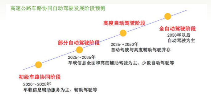 盛刚将高速公路车路协同自动驾驶的发展分成四个阶段:2020-2025年为以车载信息辅助服务为主的初级车路协同阶段;2025-2035年为以车载信息全面和高度辅助驾驶为主、少数自动驾驶的部分自动驾驶阶段;2035-2050年为自动驾驶与高度辅助驾驶并存的高度自动驾驶阶段;2050年以后为以自动驾驶为主的全自动驾驶阶段。